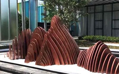 酒店不銹鋼雕塑以美為主,一般為裝飾性美陳景觀雕塑,常見于酒店大門、大堂、園林。包括但不限于水景景觀類,如圓環、噴泉、鏤空球;裝飾美陳類,如蓮花、翅膀、鵝卵石、水滴等。